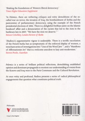 Polemics is a series of brilliant metapolitical reflections, demolishing established opinion and dominant propaganda, and reorienting our understanding of events from the Kosovo and Iraq wars to the Paris Commune and the Cultural Revolution. At once witty and profound, Badiou presents a series of radical philosophical engagements with politics, and questions what constitutes political truth.