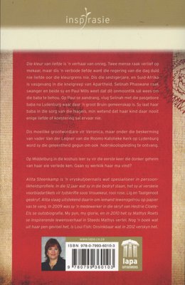 Die kleur van liefde is ’n verhaal van onreg. Twee mense raak verlief op mekaar, maar dis ’n verbode liefde want die regering van die dag duld nie liefde oor die kleurgrens nie. Dis die sestigerjare, en Suid-Afrika is vasgevang in die knelgreep van Apartheid. Selinah Phaswane raak swanger en beide sy en Paul Mills weet dat dit onmoontlik sal wees om die baba te behou. Op Paul se aandrang vlug Selinah met die pasgebore baba na Lydenburg waar daar ’n groot bruin gemeenskap is. Sy laat haar baba in die sorg van die Nagels, min wetend dat haar kind daar nooit enige liefde of koestering sal ervaar nie.
