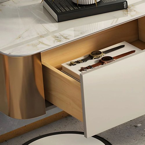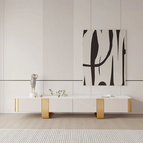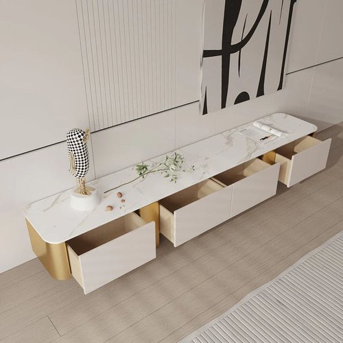 The Amy Plasma Stand is a sleek and modern entertainment unit designed to elevate contemporary living spaces. Featuring a snow-white ceramic top paired with bold champagne gold accents, it blends elegance with functionality. With a generous 220 cm length, this plasma stand offers spacious storage through discreet drawers, perfect for keeping electronics, accessories, and décor neatly organized.