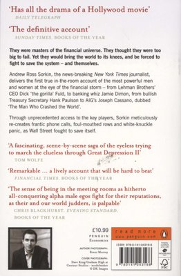 Andrew Ross Sorkin, the news-breaking New York Times journalist, delivers the first true in-the-room account of the most powerful men and women at the eye of the financial storm - from reviled Lehman Brothers CEO Dick 'the gorilla' Fuld, to banking whiz Jamie Dimon, from bullish Treasury Secretary Hank Paulson to AIG's Joseph Cassano, dubbed 'The Man Who Crashed the World'.