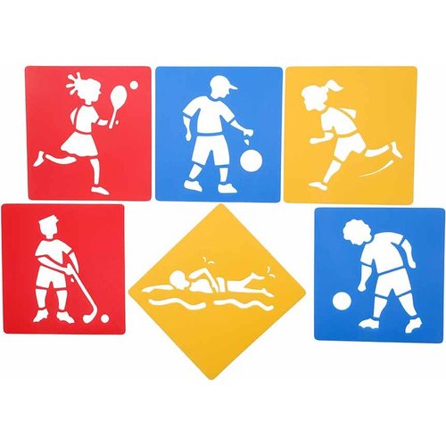 This set of 6 sports-themed plastic washable stencils including a girl playing tennis, girl swimming, girl running, boy playing basket ball, boy playing hockey and boy playing football, are ideal for use with paints, crayons, pencils and felt tip pens.