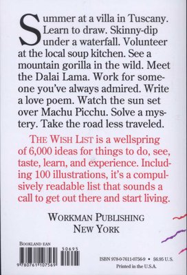 "The Wish List" is a quirky little gift book that sounds an irresistible call to get out there and start living. In the same chunky format as the authorfs bestselling "14,000 Things to Be Happy About," "The Wish List" presents a compulsively readable list of unexpected goals. There are wishes large--retrace Odysseus' route around the Mediterranean--and wishes small--find a genuine arrowhead. There are artistic wishes--write a sonnet. Athletic wishes--learn to box. Practical wishes--master the rudiments of plumbing. Whimsical wishes--become a taster at Ben & Jerry's. And fantasy wishes--live in a Venetian palazzo. "The Wish List" is meant to plant seeds, jog us out of complacency, and articulate unspoken desires.