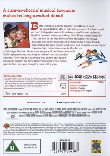 Betty Hutton (as Annie Oakley) and Howard Keel (as Frank Butler) star in this sharpshootin' funfest based on the 1,147-performance Broadway smash boasting Irving Berlin's beloved score, including Doin' What Comes Naturally, I Got the Sun in the Morning and the anthemic There's No Business like Show Business. As produced by Arthur Freed, directed by George Sidney and seen and heard in a new digital transfer from restored elements, this lavish, spirited production showcases songs and performances with bull's-eye precision, earning an Oscar* for adaptation scoring. The story is a brawling boy-meets-girl-meets-buckshot rivalry. But love finally triumphs when Annie proves that, yes, you can get a man with a gun!