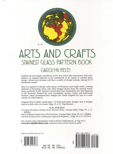 For this original collection of designs, stained glass artist Carolyn Relei has created scores of beautiful patterns inspired by the style of the Arts and Crafts era. Included are florals, sprays of blossoms and single buds, run-on patterns of flowering vines, stately tulips, fish, and a charming swan. Framed by oval, rectangular, square, round, and half-round borders, these easily adaptable and highly versatile designs will appeal to artists and artisans who admire the creations from this late-nineteenth- and early- twentieth-century movement. Dover Original. 73 black-and-white designs and 6 designs shown in full color on covers.