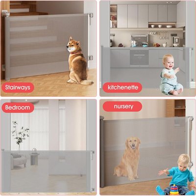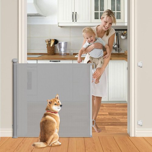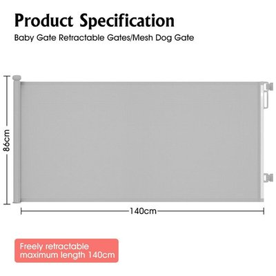 This Chenshia Extra Wide Outdoor Retractable Gate extends up to 55" wide and is 33" tall. The maximum width of the opening is 55", The best width of the opening is 35", designed to adjust to any door/stair width up to 55 inches. Mesh can be completely retracted away when not in use, saving your space. Also unlike other gates, this new retractable gate has no balustrade at the bottom - so no trip hazard when you are moving through with your hands full.