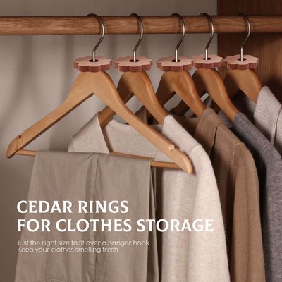These cedar pieces emit a pleasant forest fragrance, keeping your clothes fresh. The scent can be refreshed by sanding the surface to release new cedar fibers. Pre-assembled and ready to use, these rings and chips come with hooks for easy hanging in closets, wardrobes, and more. Perfect for maintaining freshness and warding off unwanted pests. Key features: