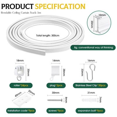 Upgrade your window treatments with Chenshia 3m Flexible Bendable Chenshia Curtain Rail Track, designed for versatility and ease of installation. This ceiling-mounted single curtain track is perfect for spaces that require curved or angled curtain installations, such as bay windows, room dividers, or shower areas. Made from durable, bendable material, this track can be easily shaped to fit your desired layout without compromising strength or stability.