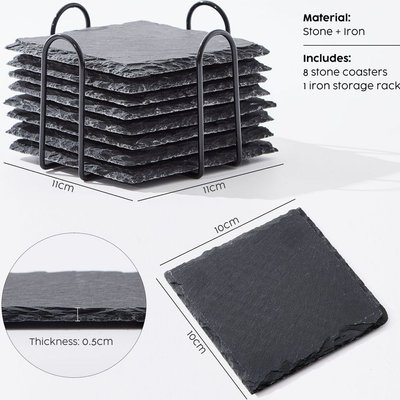 Specifications: Coasters typically measure 10cm square or 10cm diameter, with a thickness of approximately 0.4-0.6cm. The iron rack securely holds eight coasters, making it suitable for placement on tabletops or within cupboards.