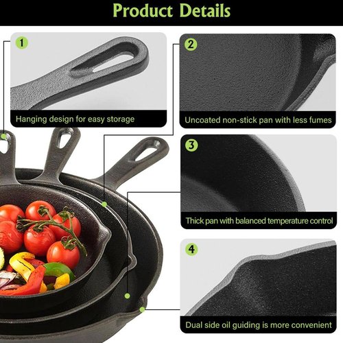 - Seasoning Guide: Our skillets are pre-seasoned but it is recommended to season the cast iron pan set with any vegetable oil before use. After washing, rub some oil over your cookware's surface and place it in an oven at low temperature for the oil to seep in.