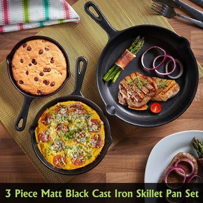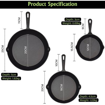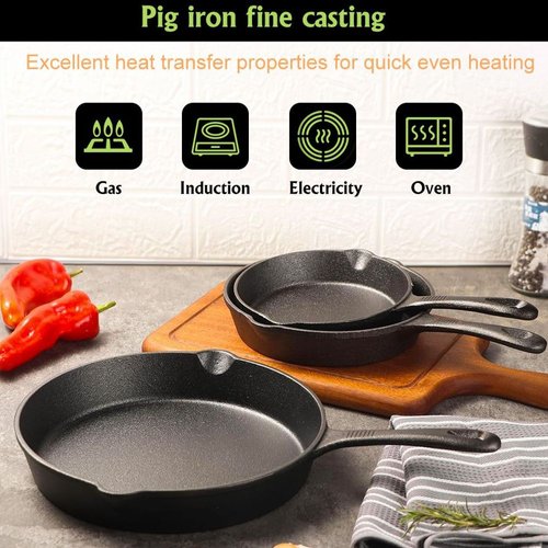 - Cast Iron Skillet Pan Set: The bundle of three includes 10, 8, and 6 inches Chenshia pre-seasoned frying pans; ideal sizes for domestic and outdoor use. Our cast iron pan set comes with unique handles for easy maneuvering and pouring.