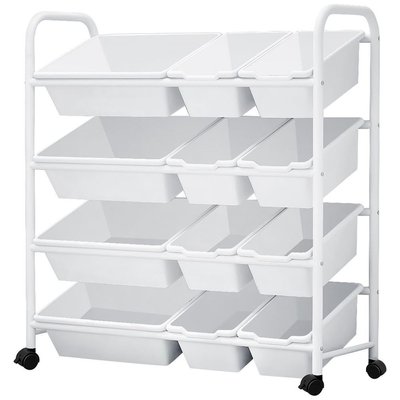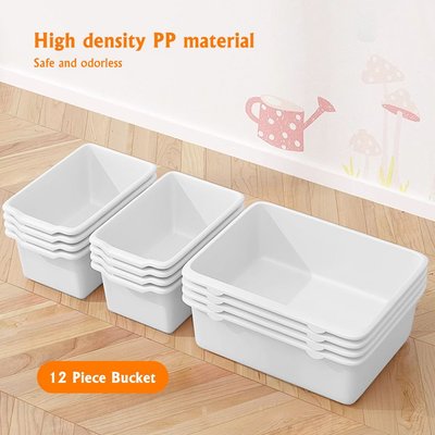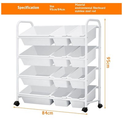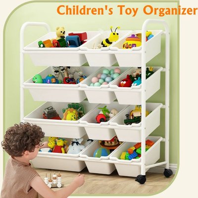 Toy organizers with 12 plastic bins(9 standard size and 3 large size) to storage different toys orderly which can helps kids learn and practice organization and clean-up skills.
