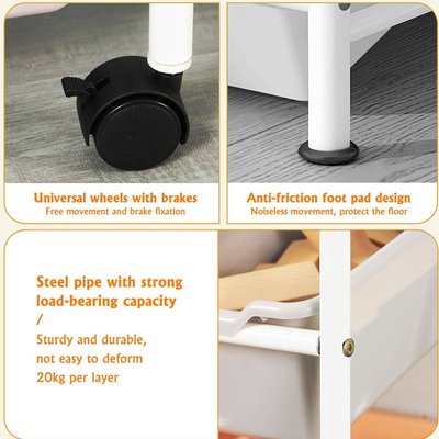 Metal kids storage shelf with bins is not only a great toy storage organizer to storage and organize toys and books, but also a great storage shelf to storage any small staffs you want; Four rollers mounted on the bottom of the toy shelf, you can move and use the toy storage shelf easily.