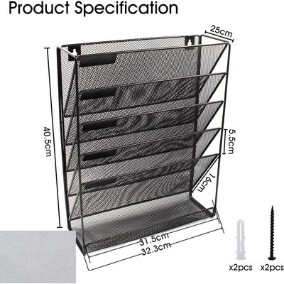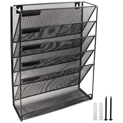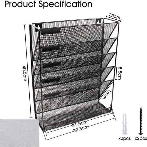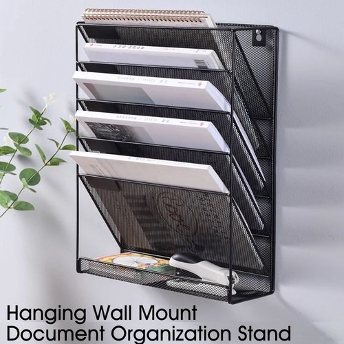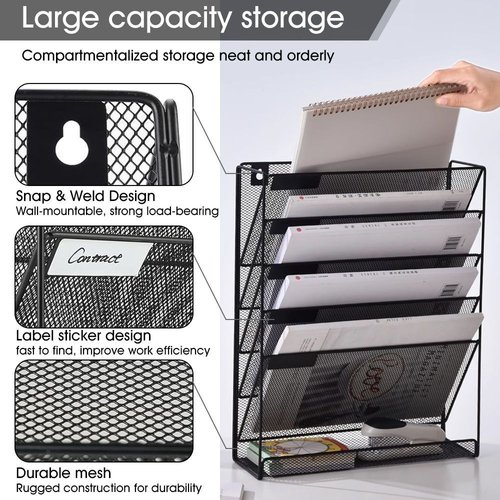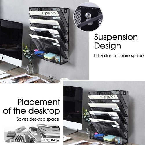 5 vertical pockets wall mounted compartments with small label, which is great for sorting files; The bottom 1 flat tray is great for stationery, such as knives, rulers, keys, tapes and other desk accessories