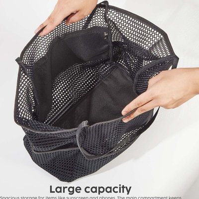 Made from high-quality nylon and polyester fiber with a diamond mesh design, it's both durable and lightweight. The waterproof, thickened bottom keeps your belongings off wet sand and floors. Beyond the beach, this versatile bag works as a supermarket tote, picnic bag, laundry bag, gym bag, shopping bag, toy storage, or utility bag. When not in use, it folds flat for easy storage, making it a practical and stylish accessory that every family needs.
