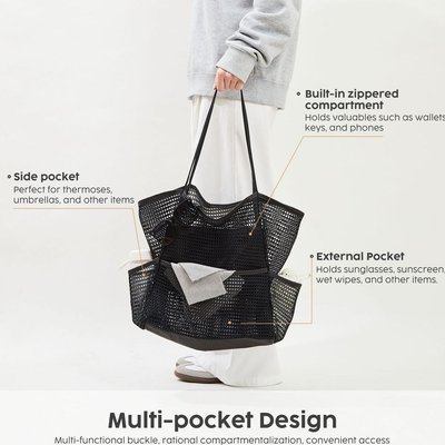 Chenshia's large mesh beach bag offers plenty of room for all your essentials at the beach or pool. Measuring 14 inches long, 6.5 inches wide, and 15.36 inches high, it has a generous capacity for sunscreen, swimsuits, towels, shoes, sunglasses, water bottles, and more. The bag features a zippered inner compartment and four large exterior pockets for easy organization of smaller items.