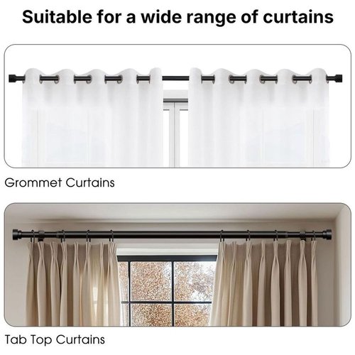 Chenshia's Heavy duty curtain rods can hold up to 50 pounds, each 1-inch diameter setional rod overlaps and screws into the next, which reinforces the unit and allows for custom length. Multiple uses, Compatible for light and medium, great for grommet, back tab, rod pocket, and tab top curtains on your living room, bedroom, sliding door, nursery, cafe, and more. Easy installation, User manual include, sturdy single curtain rod comes complete with all the hardware needed for easy set-up, including brackets, screws, drywall anchors and instructions.
