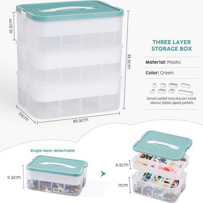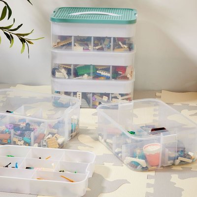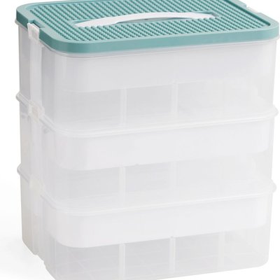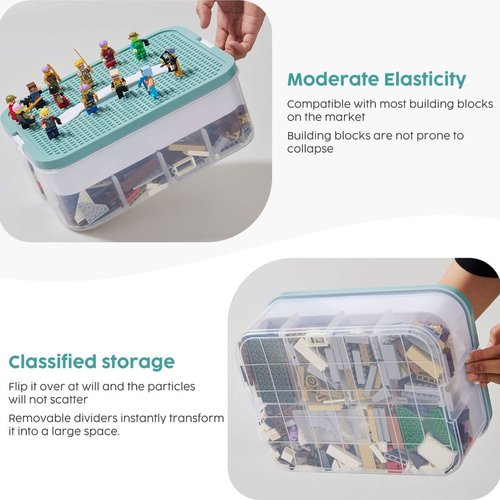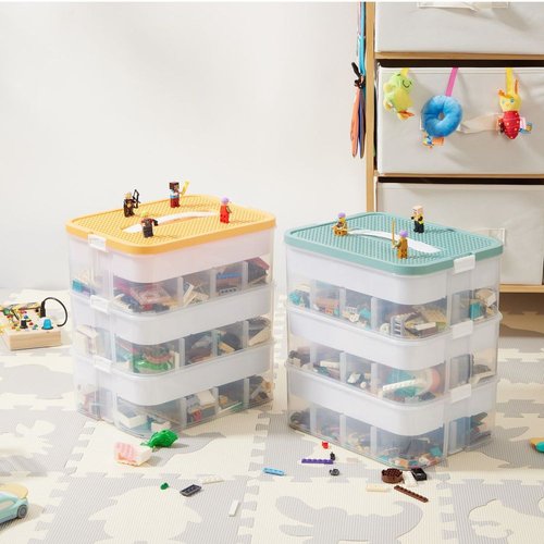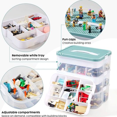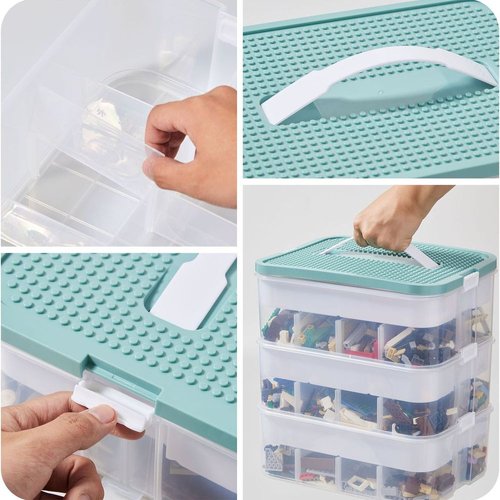 Organize and store your Lego and building blocks with Chenshia's Stackable Storage Organizer. Featuring three independent, stackable layers with adjustable compartments, this sturdy box keeps toys neatly sorted by size and color. The removable lid doubles as a building surface, allowing children to play and create anywhere. With secure locking clips, a handle for portability, and durable, non-toxic construction, it's the perfect storage solution for creative play.