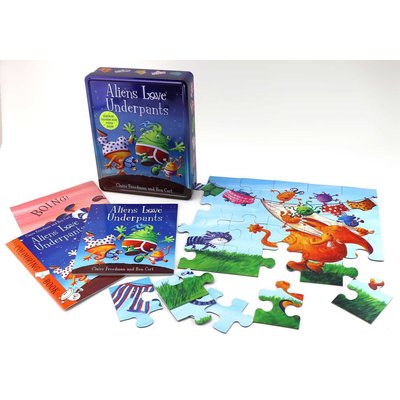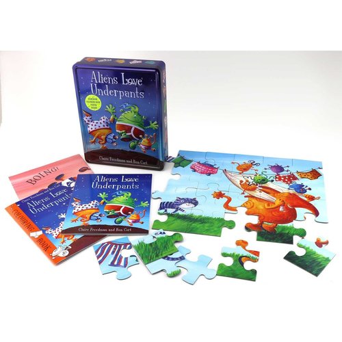 Celebrate ten wonderful years of Aliens Love Underpants with this special tin containing ALIENS LOVE UNDERPANTS, ALIENS LOVE UNDERPANTS COLOURING BOOK, a pants-tastic jigsaw puzzle and a double-sided poster to colour in! Fun for all the family, there are activities to keep everyone entertained. With Claire Freedman's brilliant rhymes and Ben Cort's zany illustrations, this tin is the perfect gift for any fan of those pesky, pants-stealing aliens! The shiny, embossed tin is great for storing books and toys.
