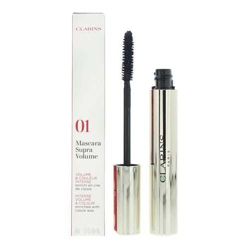 Clarins Supra Volume Mascara 01 Intense Black is a double volume effect mascara that creates an intense, full, fanned-out lash look in one quick coat. This innovative, gentle formula combines makeup and skincare benefits, enriched with Cassie Flower wax for instant intense color and volume, and a Volume Boost complex that visibly increases lash volume by up to 17.6% after four weeks of regular use. The soft bristle brush separates and coats each lash for clump-free, smudge-proof results, leaving lashes thicker, smoother, and protected without stiffness. Ideal for all-day wear, it nourishes with Panthenol while delivering rich, long-lasting black pigment for dramatically enhanced eyes.