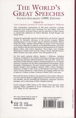 Nearly 300 speeches from nearly every historical era and nation will inspire readers and provide public speakers with ideas for powerful openings, effective transitions, and impressive endings. Addresses by Socrates, Julius Caesar, St. Francis, Martin Luther, Napoleon, Victor Hugo, Mohandas K. Gandhi, Winston Churchill, Fulton J. Sheen, Barbara Jordan, Malcolm X, Ronald Reagan, Nelson Mandela, Earl of Spencer, and many others offer provocative themes, historic parallels, and memorable quotations.