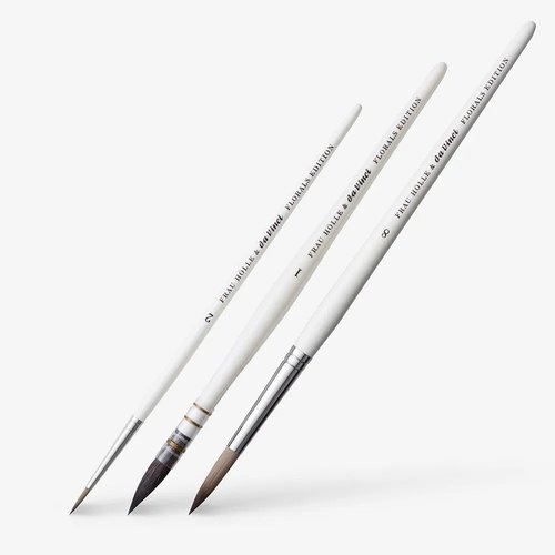 The extra pointed two synthetic brushes have been developed with Frau Hölle and are useful alongside the third brush, the traditional wash brush made with pure squirrel hair. The set is well suited for painting florals such as roses, chrysanthemums, herbs, and so on.