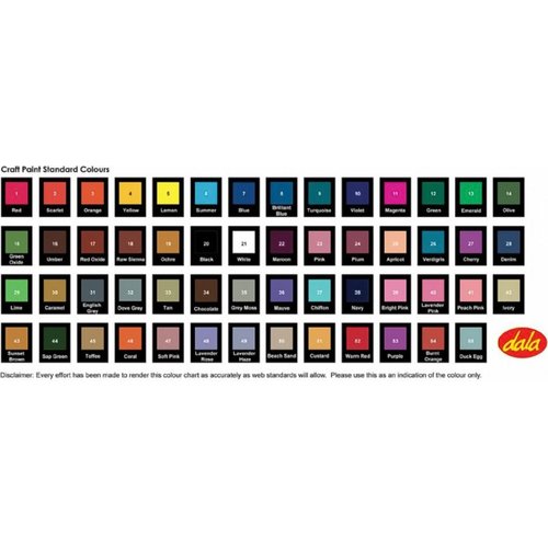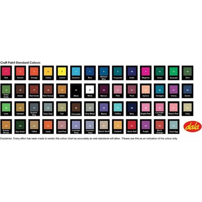 Dala Craft Paint is a quality art product that is popular amongst artists and crafters. All colours offer superior hiding power and dry to a durable and satin sheen waterproof finish. Due to its built in UV resistance, Dala Craft Paint can be used indoors and outdoors. Can be used on a variety of materials including canvas, cardstock and paper, stones, unglazed pottery, concrete, plaster, clay items, plastic, metal and more. Seal painted items with a layer of water-based varnish such as Dala Deco Varnish or with a solvent-based equivalent.