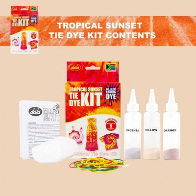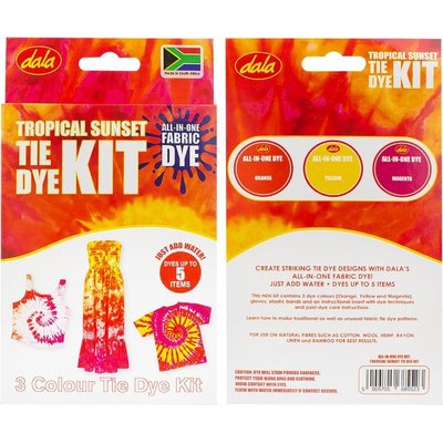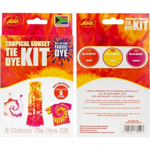 Create beautiful tropical sunset tie dye designs with Dala's Tropical Sunset Tie Dye Kit. Just add water and it dyes up to 5 items.
