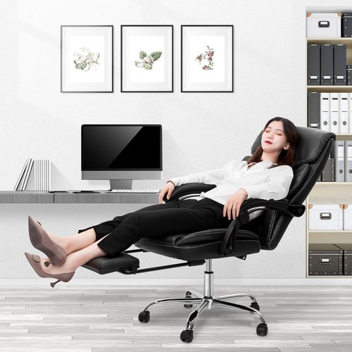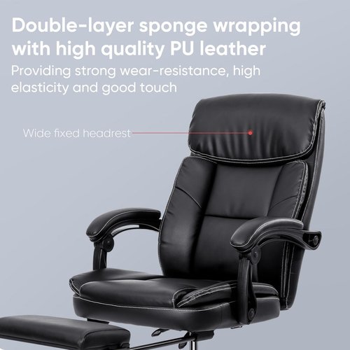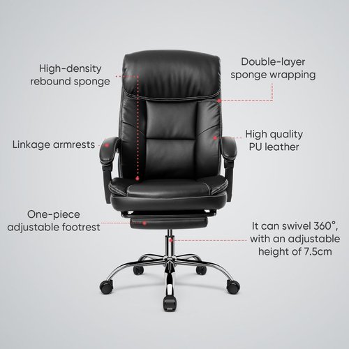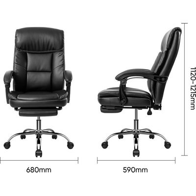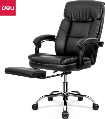 The Deli Black PU Leather Executive Chair with Extendable Leg Rest is designed to provide both comfort and functionality for professionals who spend extended hours at their desks. Its ergonomic design features a high-density rebound sponge seat and backrest, ensuring optimal support and comfort. The chair is upholstered in durable PU leather, offering a sleek appearance and easy maintenance. An extendable footrest, reaching up to 40 cm, allows users to recline and relax during breaks. The chair also includes a gas lift mechanism for height adjustment, a tilt function for reclining, and smooth-rolling casters for mobility. With a sturdy construction, it supports a maximum weight of 160 kg.