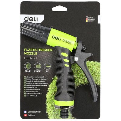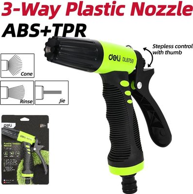 The Deli 3-Way Spray Nozzle (3/4") is a durable and versatile garden tool designed to meet a variety of watering needs with ease. Made from high-quality impact-resistant plastic, this nozzle offers long-lasting performance and resistance to rust and corrosion. It features three adjustable spray patterns-jet, shower, and mist-allowing you to switch effortlessly between powerful cleaning, gentle plant watering, and wide coverage. The ergonomic grip ensures comfort during prolonged use, while the universal 3/4" hose connector provides a secure fit for most standard garden hoses. Whether you're washing your car, watering the lawn, or tending to delicate flowers, this multi-functional nozzle delivers efficient water flow control and reliable performance.