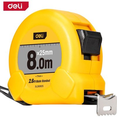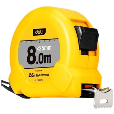 The Deli Steel Tape Measure (8mx25mm) is a durable and reliable tool designed for precision and ease of use. Its sturdy steel blade ensures long-lasting performance, while the 25mm width provides enhanced rigidity for smooth, straight measurements. The tape features clear, easy-to-read markings in both metric and imperial units, ensuring accuracy for various projects. A robust, impact-resistant case protects the tape from wear and tear, and the ergonomic, non-slip grip offers comfortable handling. The built-in automatic locking mechanism keeps the blade securely in place during use.