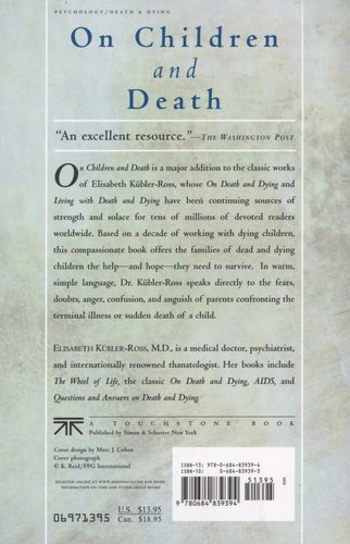 On Children and Death is a major addition to the classic works of Elisabeth Kübler-Ross, whose On Death and Dying and Living with Death and Dying have been continuing sources of strength and solace for tens of millions of devoted readers worldwide. Based on a decade of working with dying children, this compassionate book offers the families of dead and dying children the help -- and hope -- they need to survive. In warm, simple language, Dr. Kübler-Ross speaks directly to the fears, doubts, anger, confusion, and anguish of parents confronting the terminal illness or sudden death of a child.