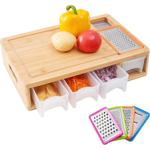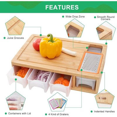 This bamboo cutting board with containers is made from untreated bamboo that is free from chemicals, water-resistant, easy to clean up. The chopping board is covered with edible oil that acts as a barrier for the bamboo, avoiding moisture efficiently.