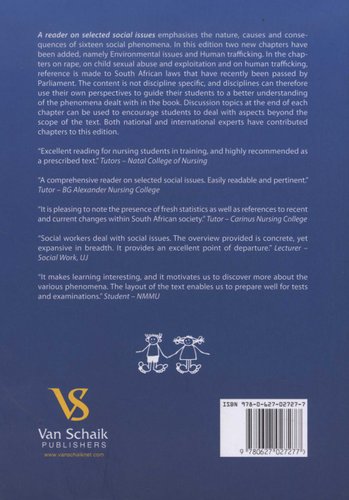 A reader on selected social issues emphasises the nature, causes and consequences of sixteen social phenomena. In this edition two new chapters have been added, namely human trafficking and environmental issues. In the chapters on rape, child sexual abuse and human trafficking, reference is made to South African laws that have recently been passed by Parliament. The content is not discipline specific, and disciplines can therefore use their own perspectives to guide their students to a better understanding of the phenomena dealt with in the title. Discussion topics at the end of each chapter can be used to encourage students to deal with aspects beyond the scope of the text. Both national and international experts have contributed chapters to this edition.