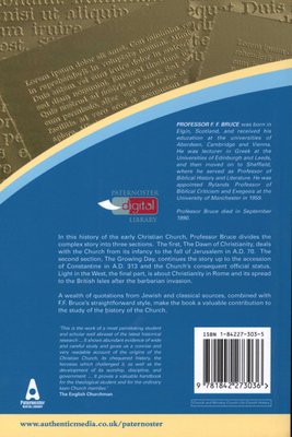 In this history of the early Christian Church, Professor Bruce divides the complex story into three sections. The first, "The Dawn of Christianity," deals with the Church from its infancy to the fall of Jerusalem in A.D. 70. The second section, "The Growing Day," continues the story up to the accession of Constantine in A.D. 313 and the Church's consequent official status. "Light in the West," the final part, is about Christianity in Rome and its spread to the British Isles after the barbarian invasion. The picture that emerges is of the Church as an unquenchable spiritual force organized for tribulation, whose spiritual resources are never more unlimited than in times of seeming disaster. A wealth of quotations from Jewish and classical sources, combined with F.F. Bruce's straightforward style, make this book a valuable contribution to the study of the history of the Church.