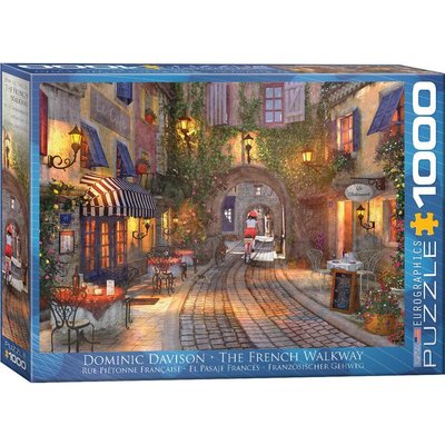 Box size: 10" x 14" x 2.37". Finished Puzzle Size: 19.25" x 26.5".A romantic cobblestone street in France is captured by artist Dominic DavisonStrong high-quality puzzle pieces.Made from recycled board and printed with vegetable based ink.