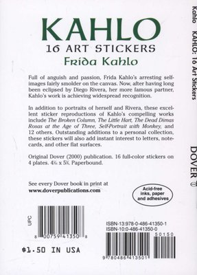 Full of anguish and passion, Frida Kahlo's arresting self-images fairly smolder on the canvas. Now, after having long been eclipsed by Diego Rivera, her more famous partner, Kahlo's work is achieving widespread recognition. In addition to portraits of herself and Rivera, these excellent new sticker reproductions of Kahlo's compelling works include The Broken Column, Portrait of Don Guillermo Kahlo, The Deceased Dimas, Still Life with Parrot, and many others.