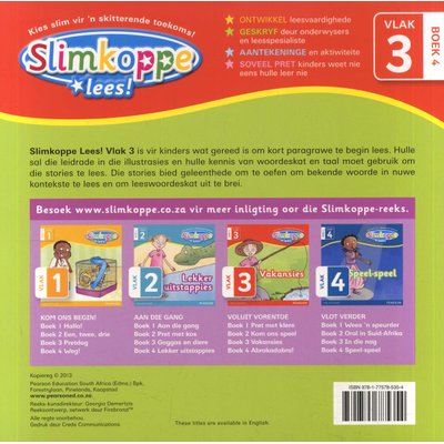 Die Slimkoppe-leesreeks is deur onderwysers en leesspesialiste spesiaal ontwikkel om kinders met selfvertroue aan die lees te kry en by hulle 'n liefde vir lees aan te wakker. Die reeks is perfek vir kinders wat geskrewe woorde begin herken. Elke boek slu