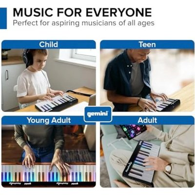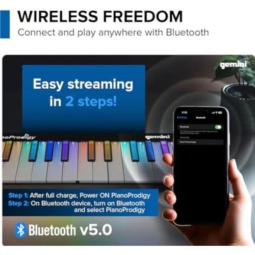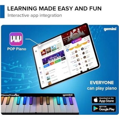 Discover the joy of playing piano with PianoProdigy, Gemini's cutting-edge MIDI keyboard that brings music to life. Designed for aspiring musicians of all ages, this wireless Bluetooth piano makes learning the piano a fun and interactive experience. Seamlessly connect to your iOS or Android device, and explore your favorite music apps with ease. Our dedicated POP Piano app, teaches piano with illuminating keys, ensuring you never miss a note. Take your musical journey further with the expandable feature, allowing you to magnetically attach multiple units and create a larger keyboard as your skills level up. This is the perfect starter Piano for the digital age!
