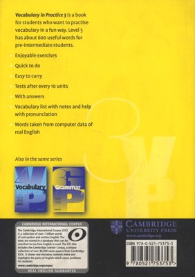 This book will help to put the fun back into vocabulary learning!Vocabulary in Practice 3 is short and easy to carry. It contains 40 units of vocabulary exercises for pre-intermediate students. There are also regular tests after every 10 units to review progress. This book is designed for busy people to use outside of the classroom. The exercises are quick to do and students can check their answers immediately. The vocabulary is arranged by topic and the test units ensure that the vocabulary is recycled. At the back of the book there are useful word lists with notes and help on pronunciation. All the words have been chosen using the Cambridge International Corpus to ensure that the most important words students will need are included.