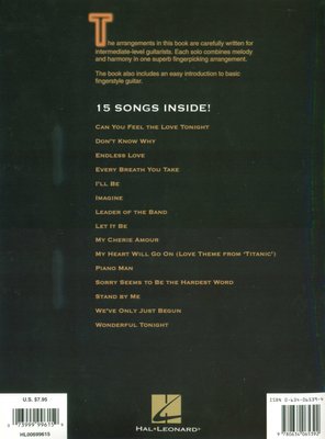 (Guitar Solo). The arrangements in this book are carefully written for intermediate-level guitarists. Each solo combines melody and harmony in one superb fingerpicking arrangement. The book also includes an easy introduction to basic fingerstyle guitar. Songs include: Can You Feel the Love Tonight * Don't Know Why * Endless Love * Every Breath You Take * I'll Be * Imagine * Leader of the Band * Let It Be * My Heart Will Go On * Piano Man * Stand by Me * Wonderful Tonight * and more.