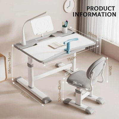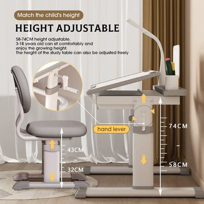 Designed for Growing Minds Our study tables are adjustable and ergonomic,you can easily adjust height of table and chair according to the height of the child, accompanied with children growth for long-term use. The height of the desk is adjustable between 58cm and 74cm, and the height of the chair is adjustable between 32cm and 43cm, Kid study chair is perfact for children at age 3-18 Years.(depending on the height of a child).