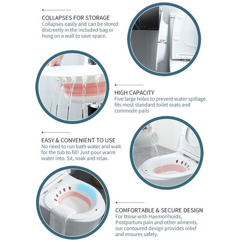This product fits over the toilet itself and is made for comfortability. So many options for relief. Simply filling the Sitz Bath with warm water, place it over the toilet, make sure you are unclothed from the waist down and off you go. It offers many soothing and healing benefits, but you can also enhance the water with lavender, baking soda, apple cider vinegar or Epsom salts. Perfect with Yoni steaming herbs/products too.