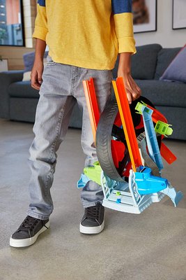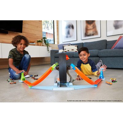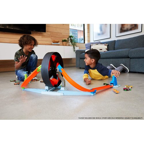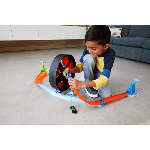 This exciting Hot Wheels® play set includes everything kids need to test their high-performance driving skills. With the spinning wheel, two launchers and two cars included, kids can challenge themselves and each other to launch their cars down the track, through the spinning wheel and hit the scoring flaps on the wheel for points! Highest score total wins the day, but the challenge itself is where the fun is. Helps develop kids' motor skills, timing and competitive drive!