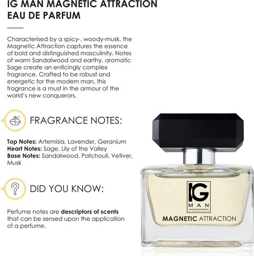 Characterised by a spicy-, woody-musk, the Magnetic Attraction captures the essence of bold and distinguished masculinity. Notes of warm Sandalwood and earthy, aromatic Sage creates an enticingly complex fragrance. Crafted to be robust and energetic for the modern man, this fragrance is a must in the armour of the world’s new conquerors.