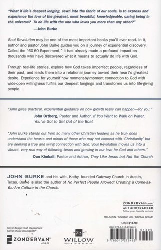 You've heard it all before. The promises for a better life get tiresome after awhile, because you know they don't deliver. However, they do touch on a profound and inescapable truth. You were created to live your life out of a rewarding, richly textured relationship with God and others---and deep down, you long to experience that kind of life. But how?Are you willing to devote sixty days to finding out?Soul Revolution may be one of the most important books you'll ever read. In it, author and pastor John Burke guides you on a journey of experiential discovery. Called the '60-60 Experiment, ' it has already made a profound impact on thousands who have discovered what it means to actually 'do life' with God.