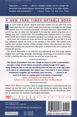 How much credit do parents deserve when their children turn out welt? How much blame when they turn out badly? Judith Rich Harris has a message that will change parents' lives: The "nurture assumption" -- the belief that what makes children turn out the way they do, aside from their genes, is the way their parents bring them up -- is nothing more than a cultural myth. This electrifying book explodes some of our unquestioned beliefs about children and parents and gives us a radically new view of childhood.