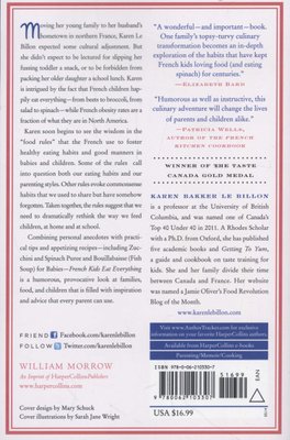 Moving her young family to her husband's hometown in northern France, Karen Le Billon expected some cultural adjustment. But she didn't expect to be lectured for slipping her fussing toddler a snack, or to be forbidden from packing her older daughter a school lunch. Karen is intrigued by the fact that French children happily eat everything--from beets to broccoli, from salad to spinach--while French obesity rates are a fraction of what they are in North America.
