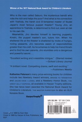Meamwhile, Jiro devotes himself to learning puppetry. Kinshi, the puppet master's son, tutors him. When his sheltered life at the theater is shattered by mobs of hungry, rioting peasants, Jiro becomes aware of responsibilities greater that his craft. As he schemes to help his friend Kinshi and to find his own parent, Jiro stumbles onto a dangerous and powerful secret....