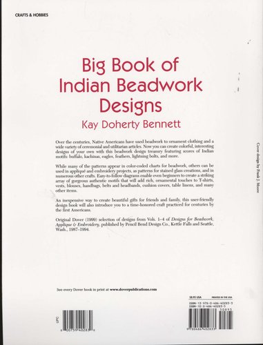 Easy-to-follow diagrams and simple instructions enable even beginners to create a host of striking Native American designs. Color-coded patterns for buffalo, kachinas, eagles and more will add delightful ornamental touches to T-shirts, vests and blouses, lend distinctive touches to handbags, headbands, and belts, and enhance cushion covers, table linens, and other household accessories. An inexpensive do-it-yourself book for successfully completing dozens of beautiful projects for yourself, family and friends.