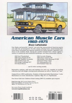 Expertly rendered illustrations of fast, flashy, and powerful sports cars, among them the 1962 Ford Thunderbird, 1964 Corvette Stingray, 1968 Chevy Impala SS427, 1969 Camaro Z-28, 1970 Ford Torino Fastback, 1971 Mustang Boss 351, 1974 Firebird Trans-Am, and 37 others. For coloring book enthusiasts and "muscle car" fans.